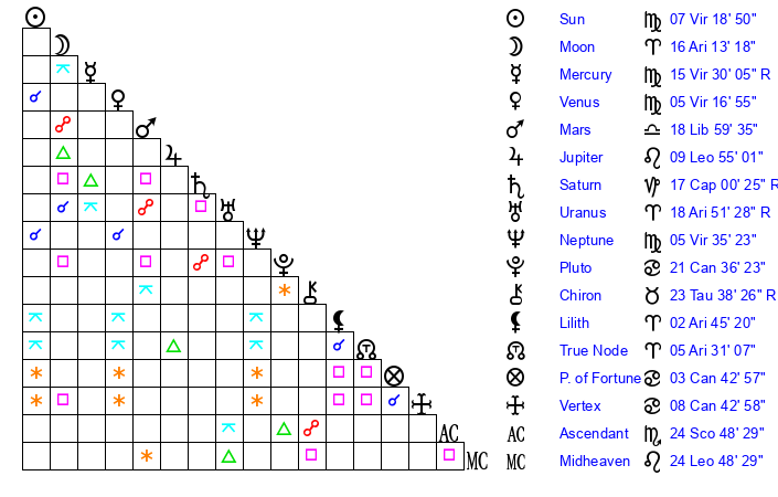 | Moon | 16 Aries 13 | 13 Sagittarius 23 | 23 Virgo 40 |