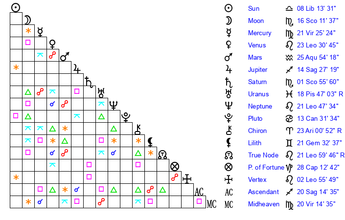 | Saturn | 2 Scorpio 28 | 27 Pisces 35 | 13 Scorpio 19 |