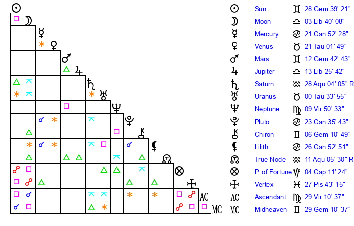 | Sun | 28 Gemini 39 | 29 Gemini 37 | 26 Virgo 3 |