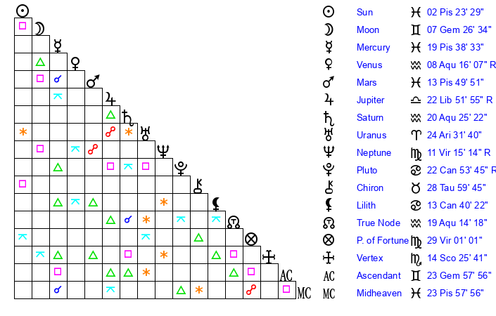 | Sun | 2 Pisces 23 | 3 Pisces 19 | 1 Gemini 51 |
