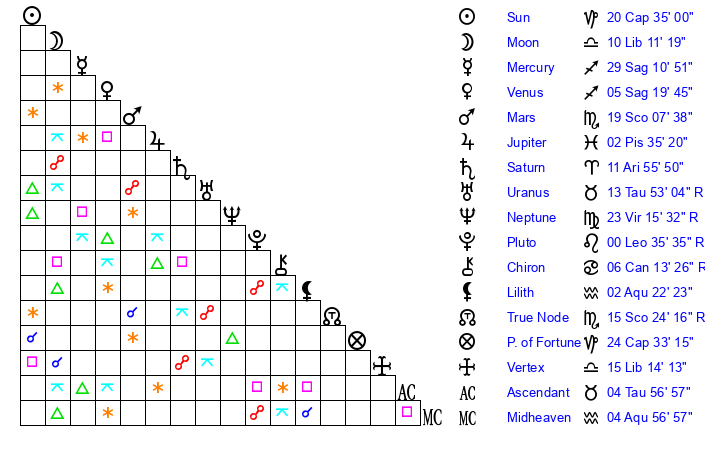 | Moon | 10 Libra 5 | 23 Gemini 27 | 1 Sagittarius 41 |