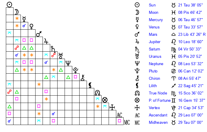 | Mercury | 6 Taurus 47 | 3 Taurus 47 | 18 Leo 30 |