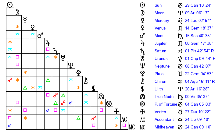| Moon | 9 Aries 5 | 2 Cancer 37 | 22 Leo 17 |