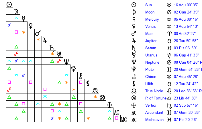 | Sun | 16 Aquarius 1 | 17 Aquarius 9 | 13 Gemini 8 |