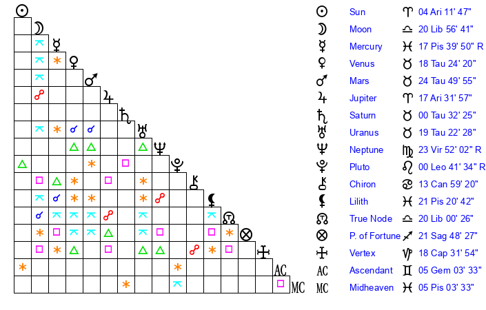 Sun | 4 Aries 12 | 4 Aries 36 | 26 Gemini 35 |