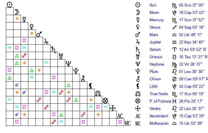 | Sun | 5 Scorpio 37 | 6 Scorpio 31 | 3 Aquarius 49 |