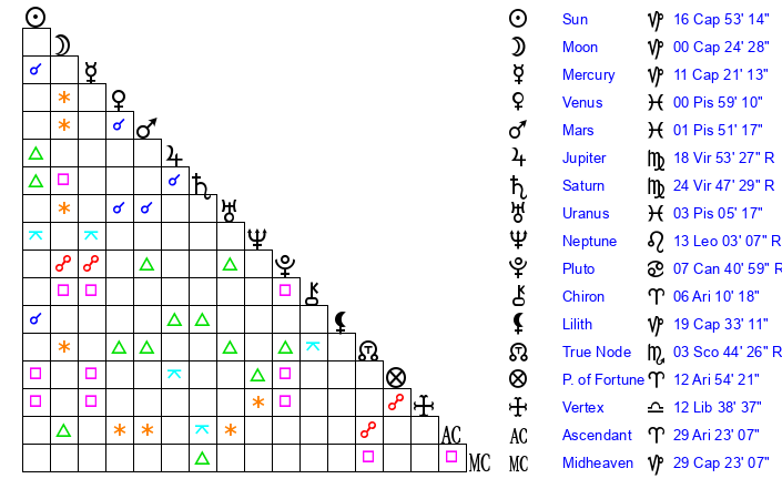 | Sun | 16 Capricorn 53 | 17 Capricorn 39 | 1 Taurus 2 |