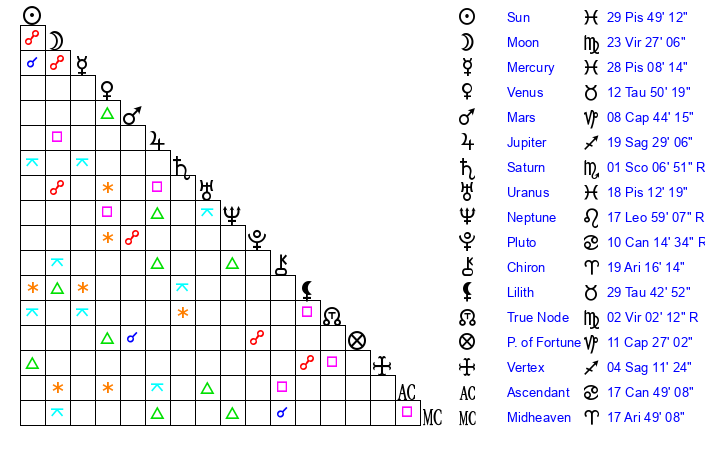 | Moon | 23 Virgo 29 | 10 Sagittarius 10 | 9 Gemini 55 |