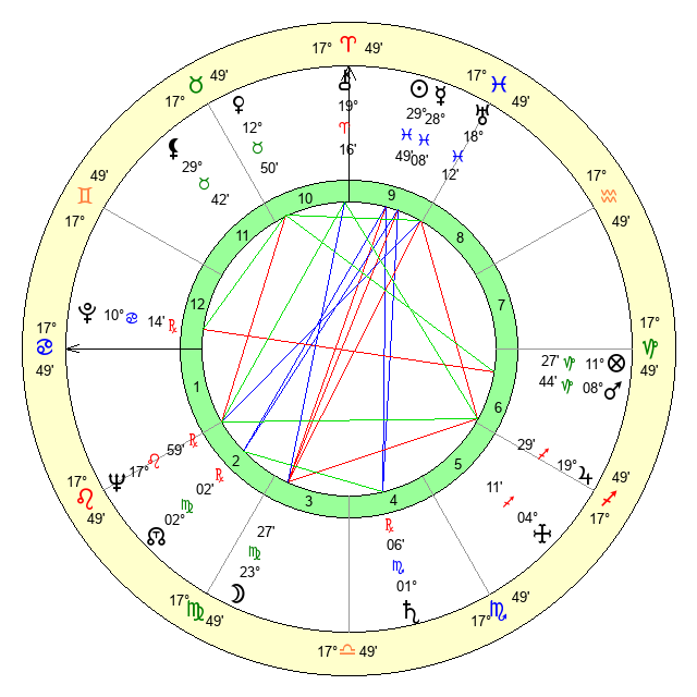 | Sun | 29 Pisces 49 | 0 Aries 20 | 7 Cancer 38 |