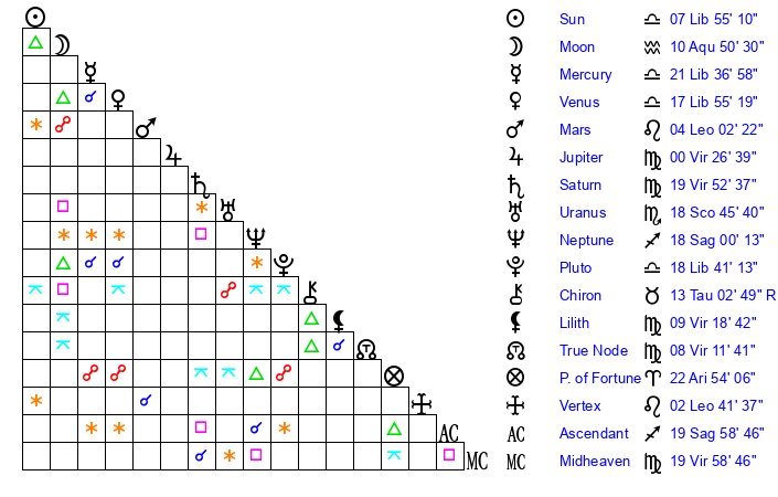 | Mercury | 21 Libra 37 | 22 Libra 18 | 1 Sagittarius 43 |