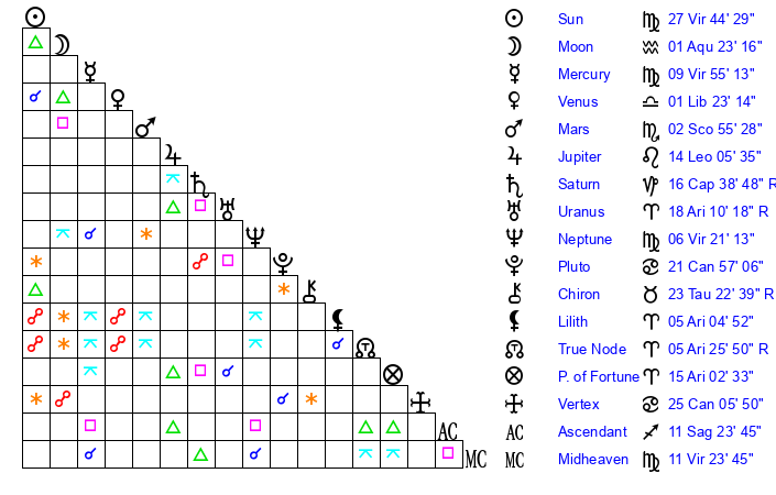 | Moon | 1 Aquarius 27 | 27 Virgo 27 | 28 Gemini 42 |