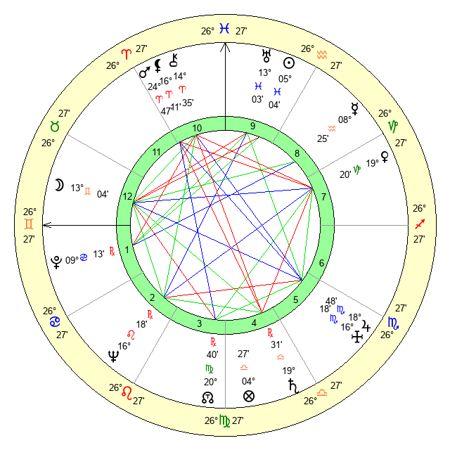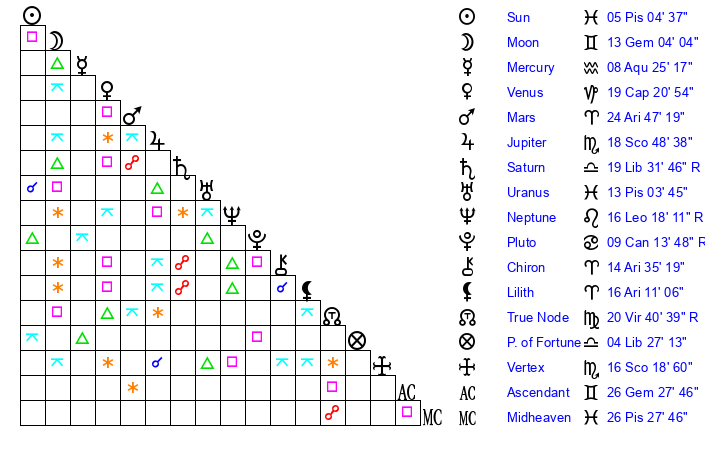 | Sun | 5 Pisces 4 | 6 Pisces 20 | 14 Gemini 57 |