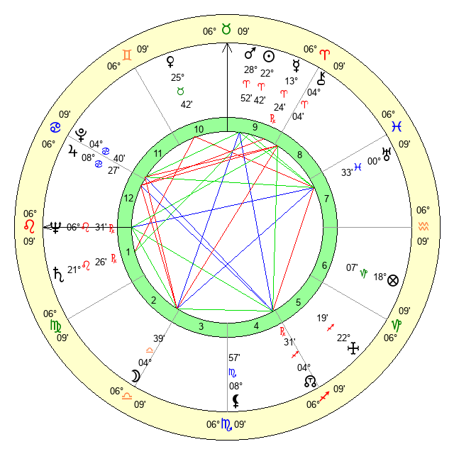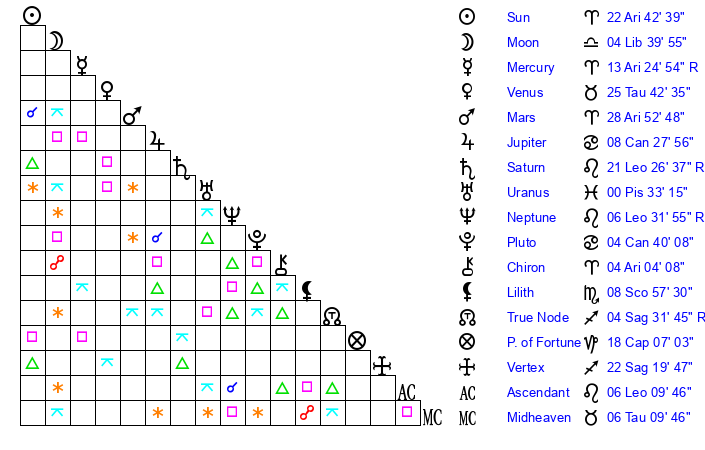 | Sun | 22 Aries 42 | 24 Aries 1 | 4 Leo 33 |