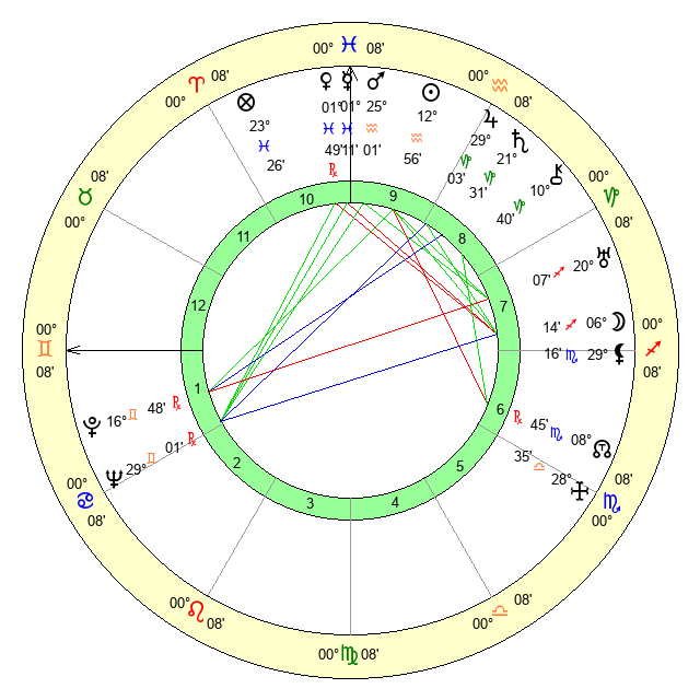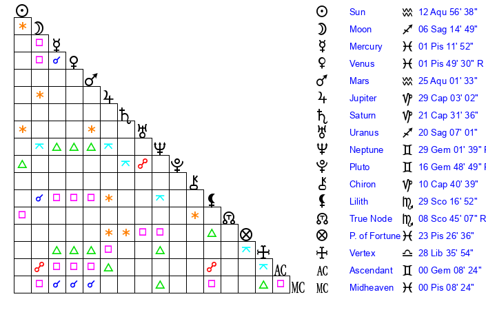 | Sun | 12 Aquarius 56 | 14 Aquarius 6 | 14 Gemini 4 |