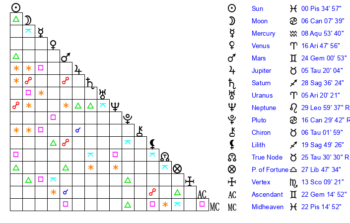 | Sun | 0 Pisces 35 | 1 Pisces 18 | 4 Gemini 56 |