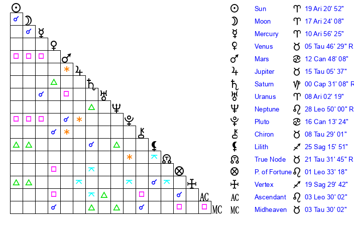 | Sun | 19 Aries 21 | 20 Aries 5 | 21 Cancer 44 |