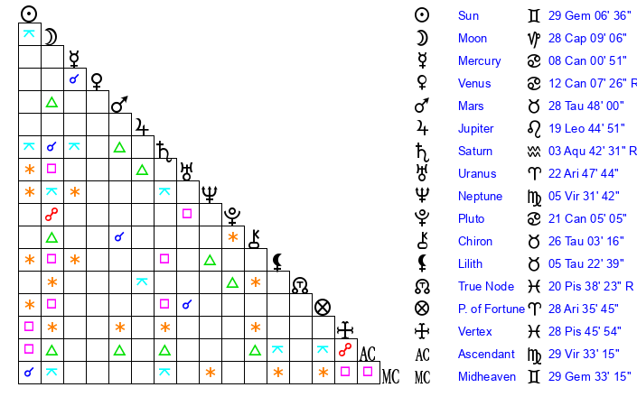 | Sun | 29 Gemini 7 | 29 Gemini 37 | 28 Virgo 29 |