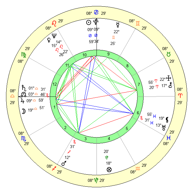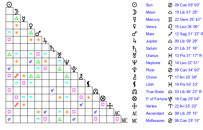 | Moon | 19 Libra 54 | 9 Libra 59 | 16 Cancer 55 |
