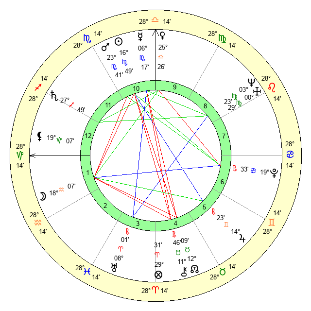| Neptune | 3 Virgo 24 | 29 Pisces 37 | 2 Virgo 26 |