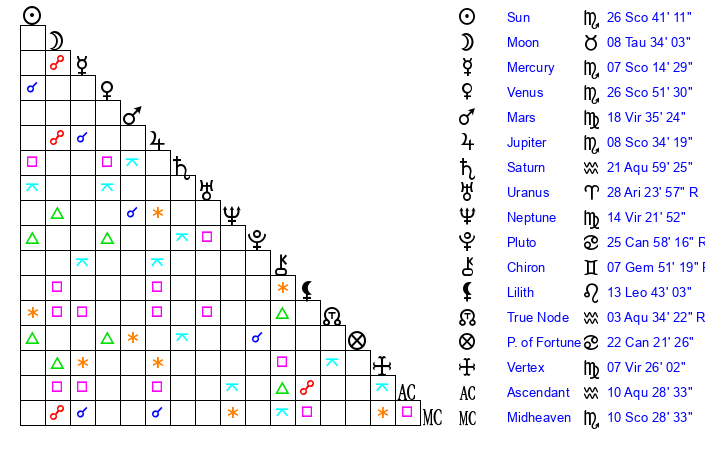 | Venus | 26 Scorpio 51 | 16 Scorpio 0 | 20 Pisces 56 |