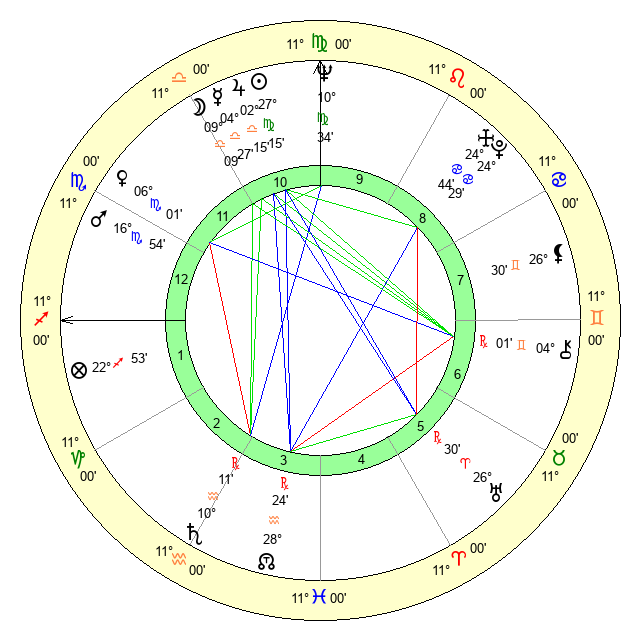 | Moon | 9 Libra 12 | 14 Virgo 58 | 2 Pisces 37 |