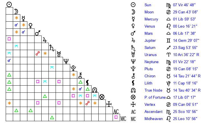 | Sun | 7 Virgo 47 | 8 Virgo 32 | 13 Sagittarius 6 |