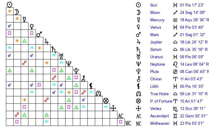| Saturn | 7 Libra 18 | 19 Pisces 37 | 1 Libra 30 |