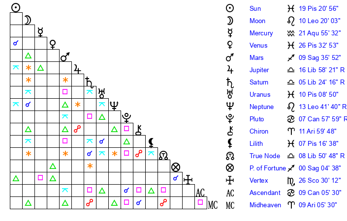 | Sun | 19 Pisces 21 | 20 Pisces 22 | 29 Gemini 30 |