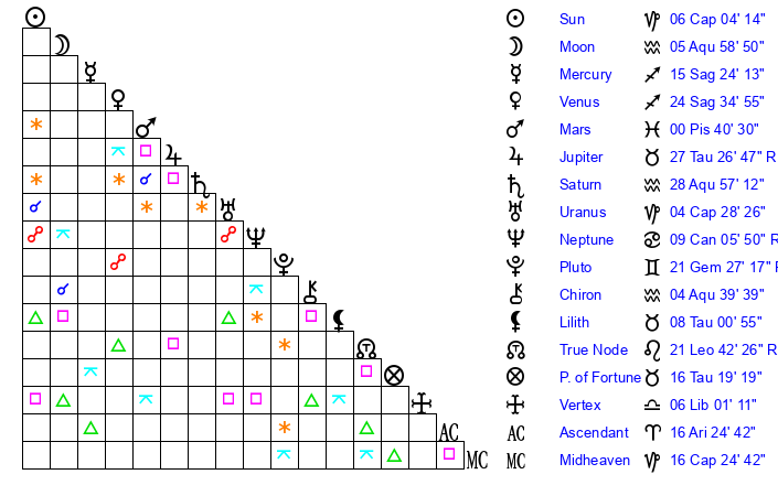 | Saturn | 29 Aquarius 23 | 25 Pisces 53 | 12 Pisces 38 |