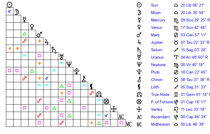 | Sun | 20 Libra 7 | 20 Libra 36 | 28 Capricorn 9 |