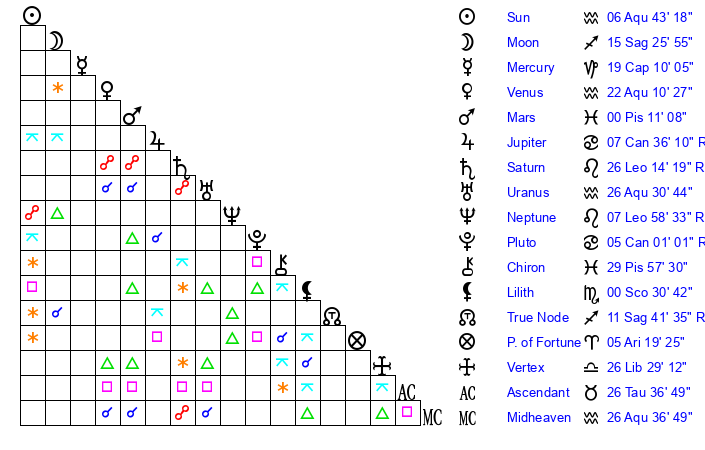 | Sun | 6 Aquarius 43 | 8 Aquarius 1 | 21 Taurus 52 |