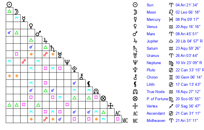| Sun | 4 Aries 21 | 5 Aries 18 | 2 Cancer 28 |