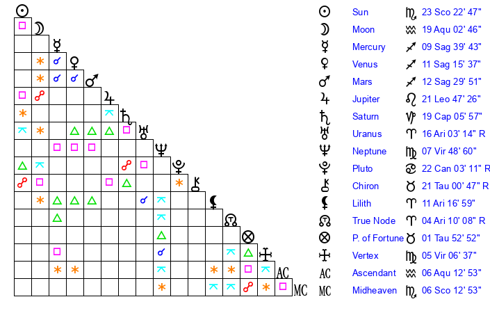 | Sun | 23 Scorpio 23 | 24 Scorpio 35 | 28 Aquarius 51 |