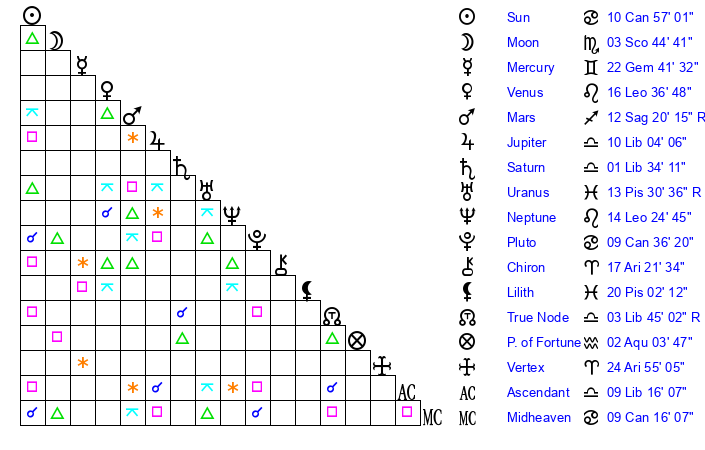| Sun | 10 Cancer 57 | 12 Cancer 1 | 20 Libra 34 |