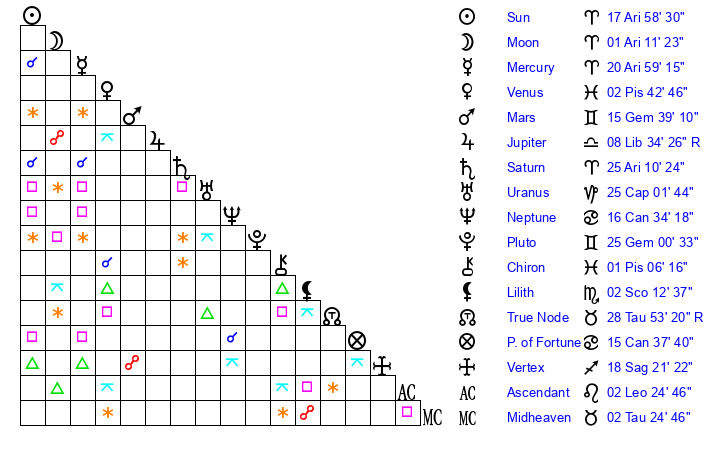 | Sun | 17 Aries 59 | 19 Aries 6 | 8 Leo 32 |