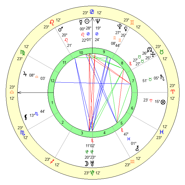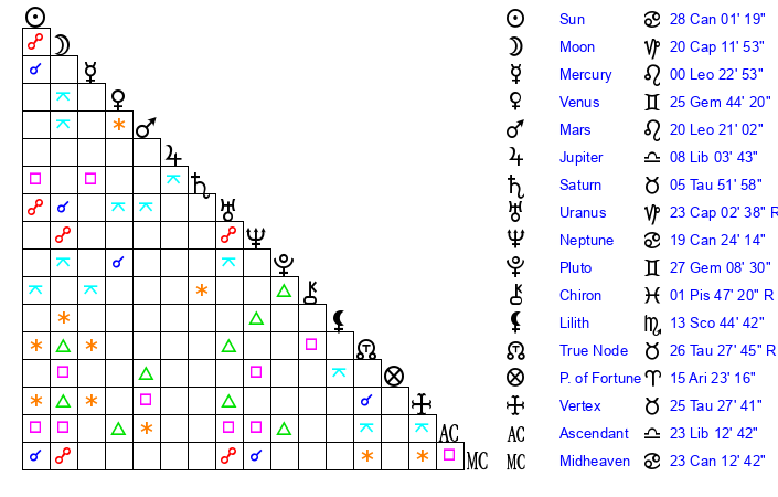 | Sun | 28 Cancer 1 | 29 Cancer 11 | 20 Scorpio 27 |