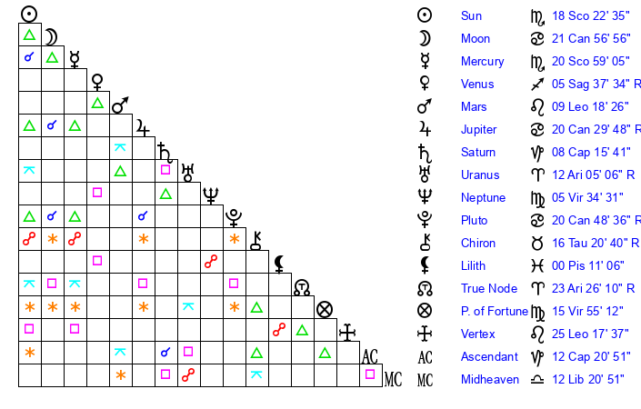 | Sun | 18 Scorpio 23 | 19 Scorpio 21 | 24 Aquarius 50 |
