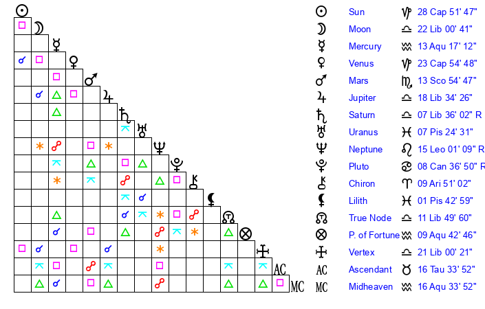 | Saturn | 8 Libra 17 | 16 Pisces 5 | 2 Libra 22 |