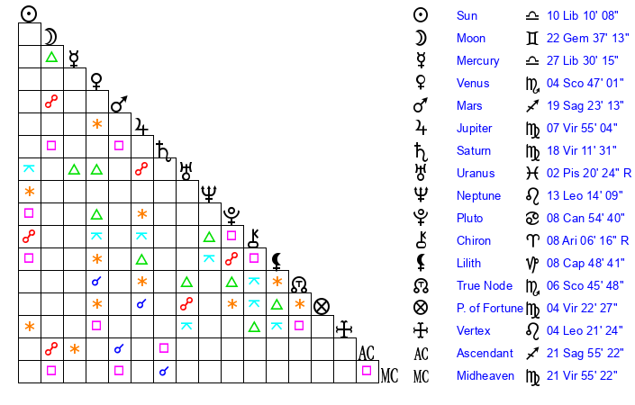 | Saturn | 18 Virgo 49 | 27 Pisces 26 | 25 Virgo 23 |
