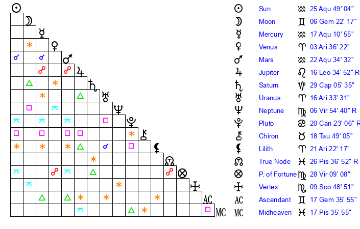 | Mars | 22 Aquarius 34 | 17 Cancer 28 | 4 Taurus 40 |