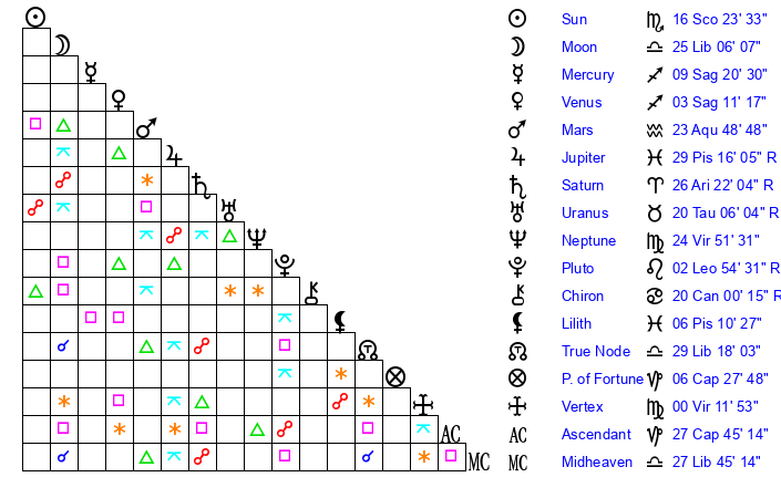 | Moon | 25 Libra 6 | 15 Cancer 28 | 21 Sagittarius 12 |