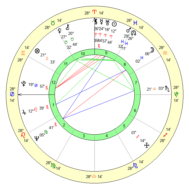 | Sun | 12 Aries 44 | 13 Aries 12 | 12 Cancer 28 |