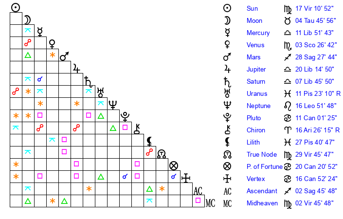 | Sun | 17 Virgo 11 | 18 Virgo 14 | 0 Capricorn 5 |