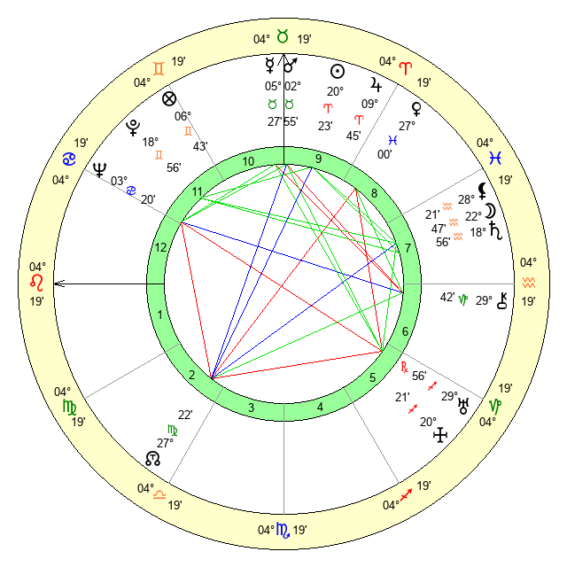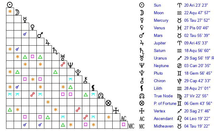 | Sun | 20 Aries 23 | 21 Aries 4 | 16 Leo 38 |