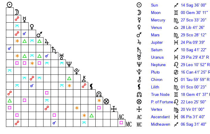 | Moon | 0 Gemini 35 | 23 Cancer 58 | 24 Sagittarius 27 |