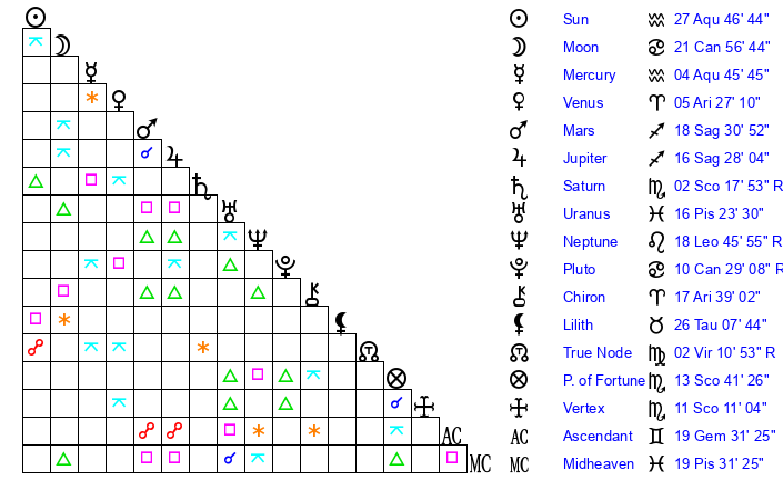 | Pluto | 10 Cancer 28 | 2 Aquarius 34 | 11 Cancer 1 |