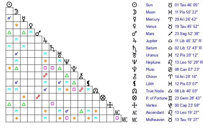 | Venus | 19 Taurus 46 | 26 Pisces 22 | 22 Virgo 29 |