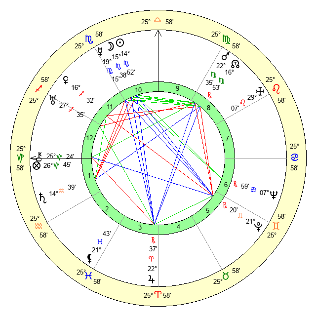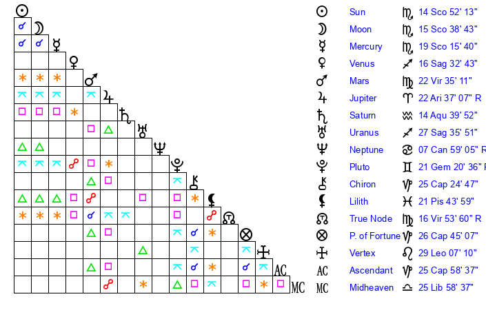 | Moon | 15 Scorpio 42 | 16 Gemini 2 | 14 Aries 20 |