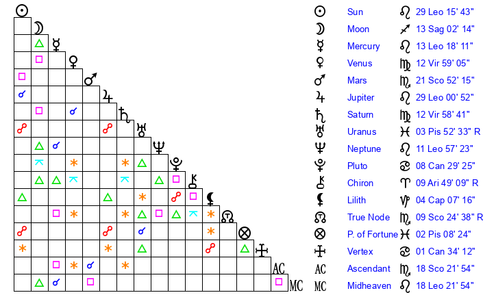 | Neptune | 11 Leo 57 | 1 Aries 34 | 13 Leo 39 |