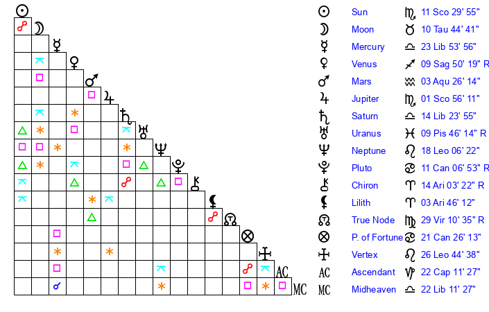 | Sun | 11 Scorpio 30 | 12 Scorpio 32 | 26 Aquarius 0 |